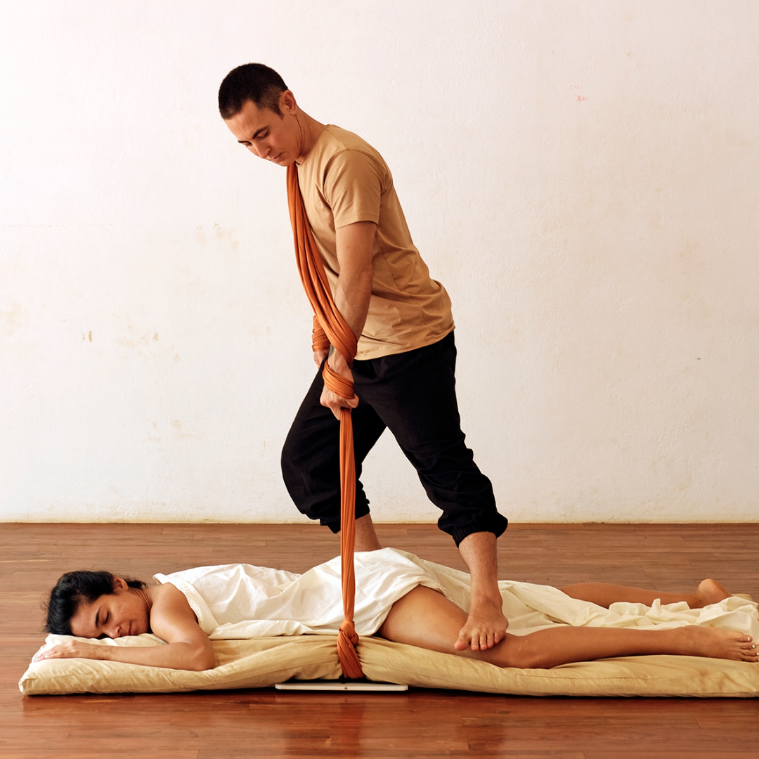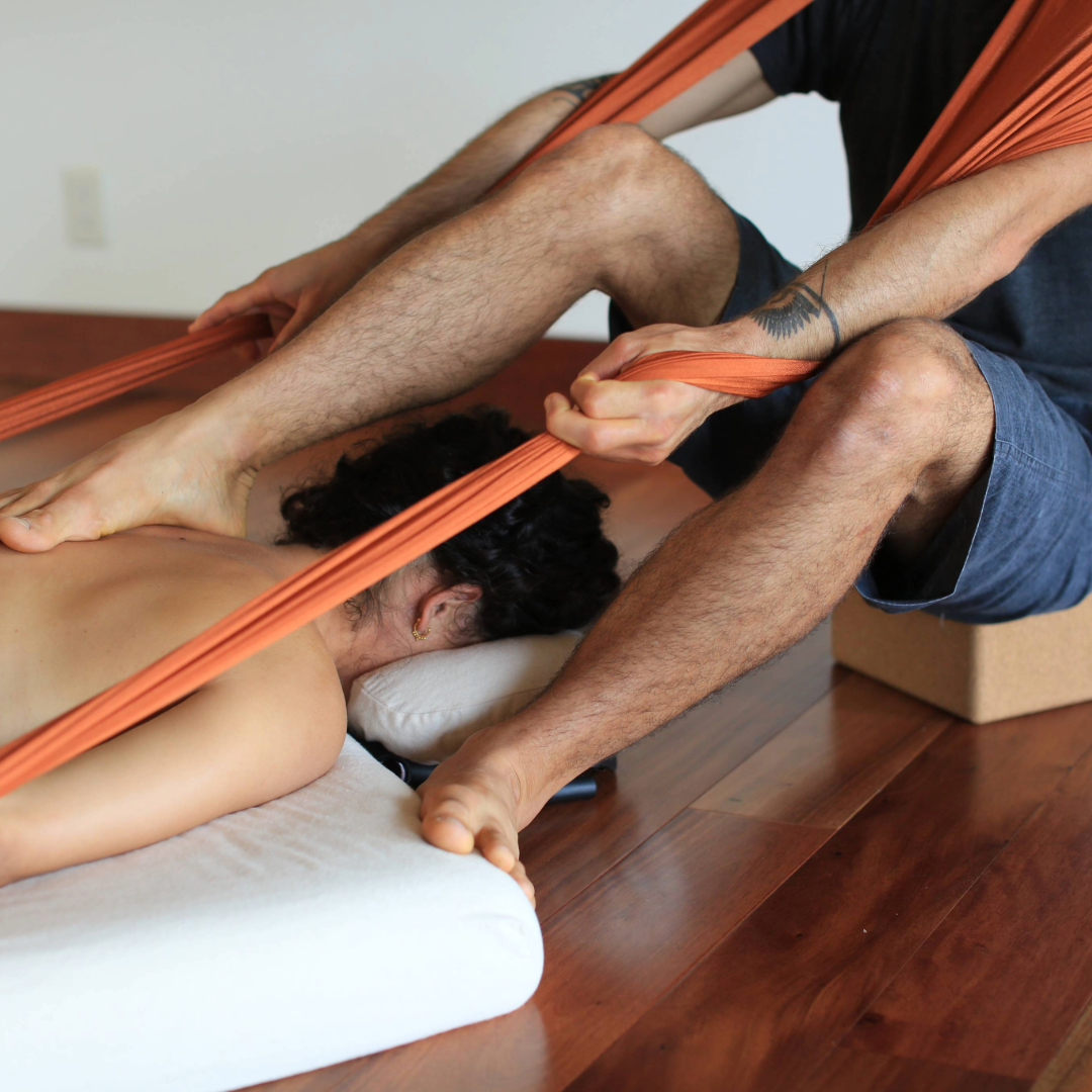 Combining the ancient art of barefoot massage with the latest fascia science, SARGA BODYWORK® practitioners utilize a length of fabric fastened to a massage table to aid in delivering therapeutic myofascial and deep tissue techniques with their bare feet.