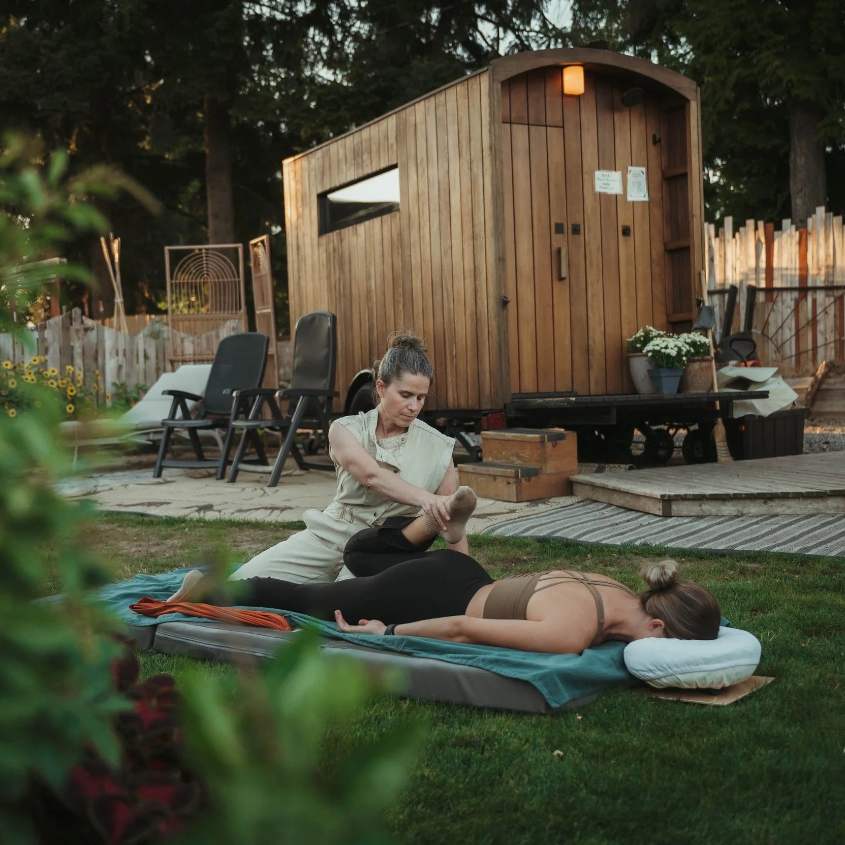 Two women in a garden setting, one lying on a mat receiving a massage from another woman.